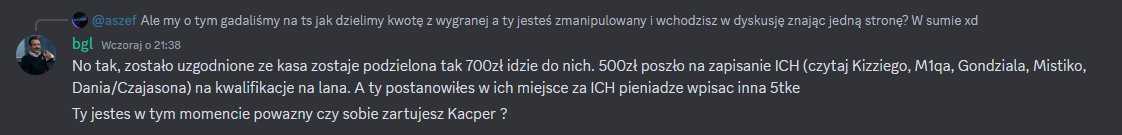 Dlaczego jednak nie możemy tutaj mówić o złodziejstwie? Wracamy do mojego poprzedniego wpisu, gdzie pojawiły się głosy, broniące zawodników. Czyli co, jak jedna organizacja jest przekręcana przez własnych graczy na 200 zł, to jest wszystko w porządku (bo pewnie ją stać, bo tak to przecież działa od dawna)? Natomiast jak inna organizacja przekręci zawodników na 500 zł, to jest już problem? Zajeżdża mi to bardzo mocno podwójnymi standardami i wydaje mi się, że trzeba w końcu coś z tym zrobić – właśnie po to, żeby nie zostawiać furtki na podobne akcje.