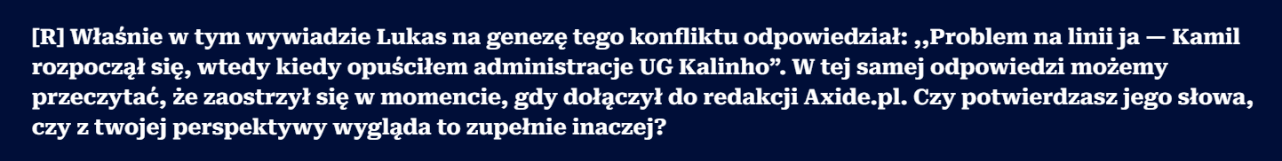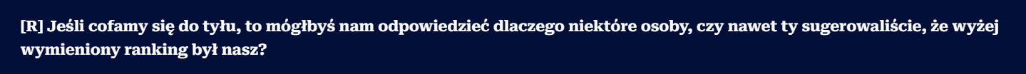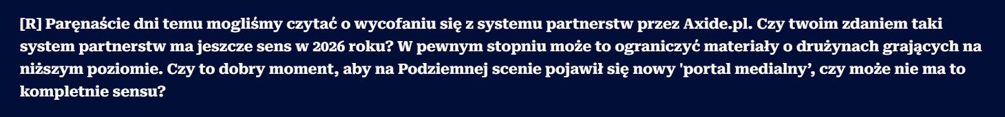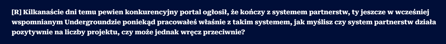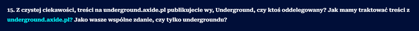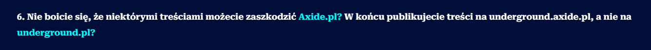 Twierdzenie, że Underground CS2 będzie szkodził wizerunkowi Axide.pl, to jest dosyć interesująca teza. Szczególnie, że w dalszej części pytania, prowadzący wywiad sam stwierdza, że strona funkcjonuje na subdomenie. Z resztą tak samo, jak na subdomenie funkcjonuje Fragownik, no ale wiadomo – to by nie pasowało do dalszej narracji.