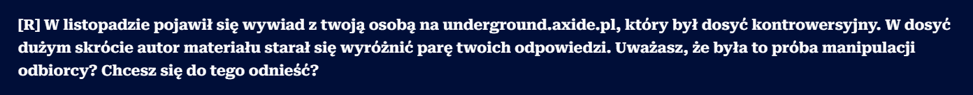 To co zaprezentował Superion w Stanie Podziemia, to jest niestety zwykła polaryzacja, przeniesiona na undergroundowe standardy. Wrzucasz do wywiadu pytanie z tezą, którego celem jest przypisanie rozmówcy do jednego z obozów i ustawienie go w kontrze do drugiego. NIE ważne co napisze, NIE ważne co robi, NIE ważne czym się zajmuje – i tak zostanie zaszufladkowany.