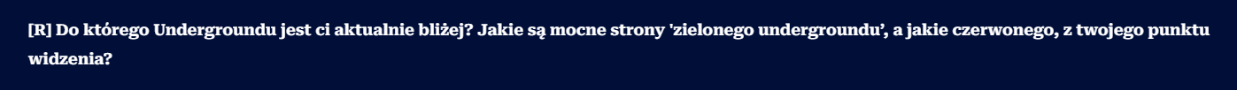 Dlaczego tak przypuszczam? Zerknijmy na to, ile padło we wszystkich tych wywiadach, pytań o nieistniejący konflikt: czerwoni kontra zieloni. Dlaczego napisałem nieistniejący? Bo jedyne co jest w stanie uświadczyć na co dzień zwykły gracz z undergroundu, to dwa podobne do siebie projekty discordów, które: rywalizują ze sobą za pomocą oferty oraz tempa rozwoju.