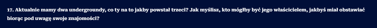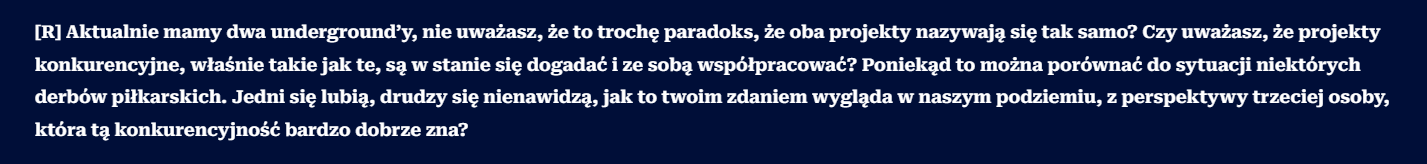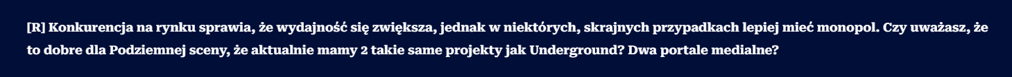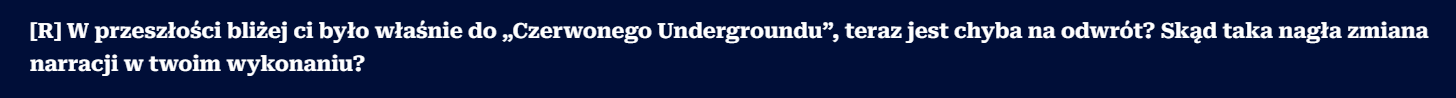 To co zaprezentował Superion w Stanie Podziemia, to jest niestety zwykła polaryzacja, przeniesiona na undergroundowe standardy. Wrzucasz do wywiadu pytanie z tezą, którego celem jest przypisanie rozmówcy do jednego z obozów i ustawienie go w kontrze do drugiego. NIE ważne co napisze, NIE ważne co robi, NIE ważne czym się zajmuje – i tak zostanie zaszufladkowany.